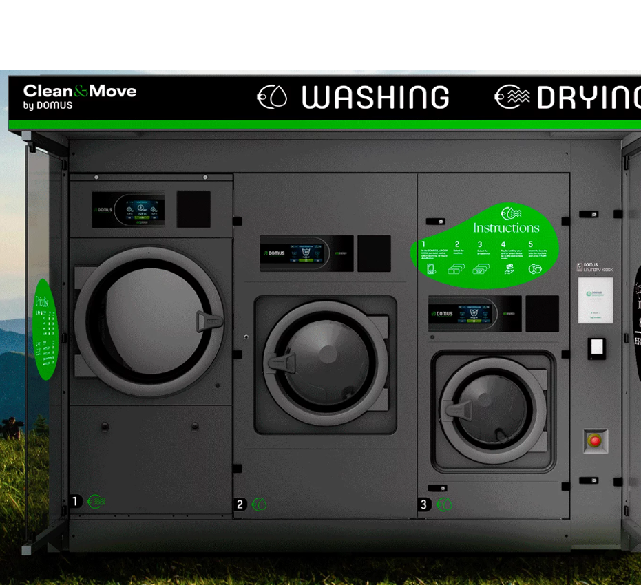 This flexible solution enables the creation of laundry facilities with ease in places like car parks, petrol station forecourts, festivals, military sites, event venues, holiday parks an temporary accommodation. With Domus Clean & Move modules, you’ll have access to a mobile self-service laundry featuring cutting-edge machinery.